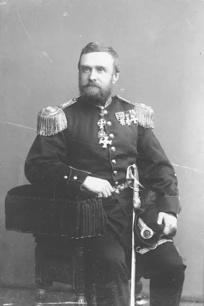 Uniform som oberstløytnant ved infanteriet slik den var reglementert fra 1877 til 1888. Med distinksjoner på hatten som reglementert 1880-1888.