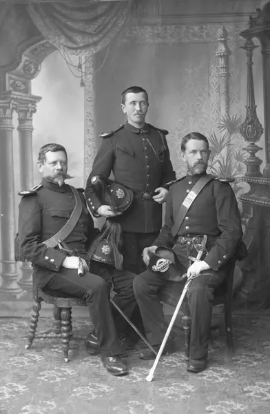 Peter Paul T. Westly (tv) i paradeuniform som fanejunker ved sanitetskorpset som reglementert 1889-1894. Ukjent person (i midten) i uniform som sersjant for sanitetskorpset som reglementert 1889-1894. Jonas T. Westly (th) i uniform som stabsfanejunker.