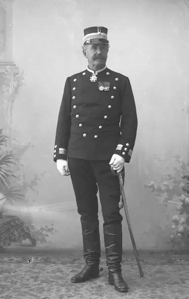 I dagliguniform som oberst ved kavaleriet som reglementert 1894-1910. Svärdsordens kommendørkors om halsen, Hederslegionens ridderkors på brystet samt en utydelig medalje.
