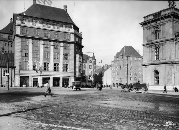 torg, forretningsgårder, Østbanestasjonen, biler, hestekjøretøyer, mennesker, gateliv
