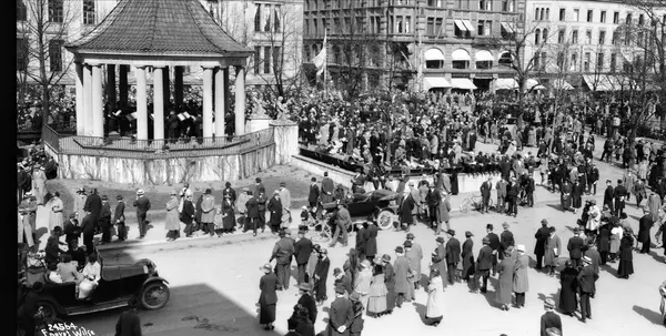 musikkpaviljong, musikkorps, publikum, biler, Universitetet, forretningsgårder
