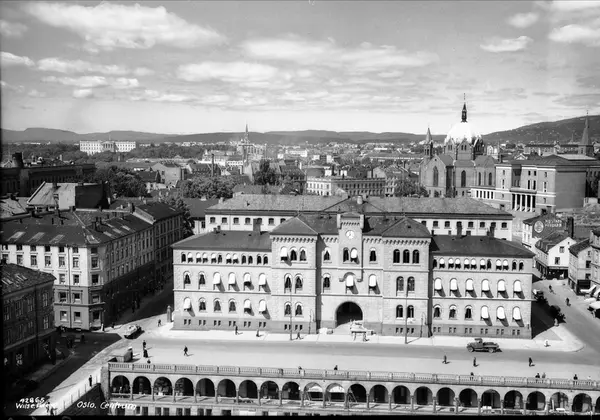 utsikt, politistasjon, Deichmanske bibliotek, Trefoldighetskirken, Slottet, forretningsgårder