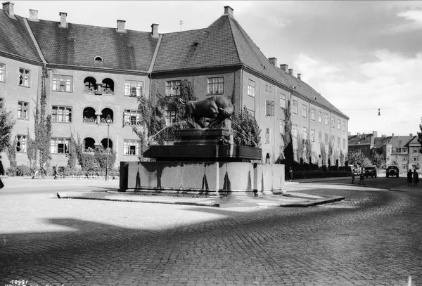 gateløp, bygårder, forhager, okseskulptur, fontene, mennesker, biler, gateliv
