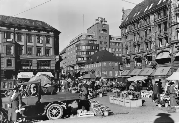 torg, torghandel, forretningsgårder, Kaffistova, Akers Sparebank, biler, mennesker, gateliv