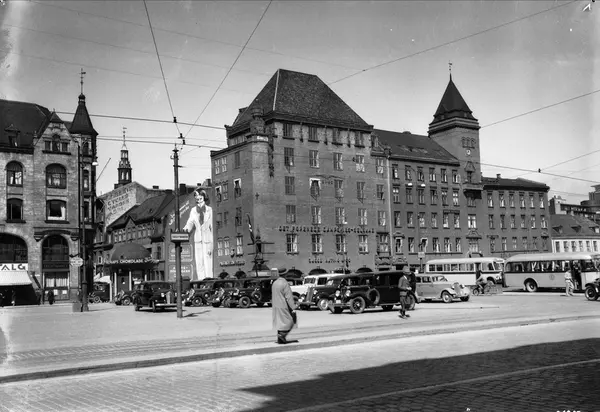 torg, forretningsgårder, gavlreklame, kiosk, biler, busser, mennesker, gateliv
