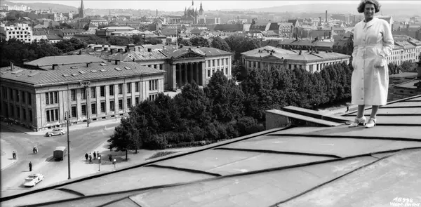 utsikt fra Torstedhjørnets tak, Universitetet, forretningsgårder, kirker, kvinne