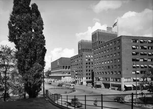 Rådhuset, kontorbygninger, forretninger, buss, biler, mennesker, gateliv