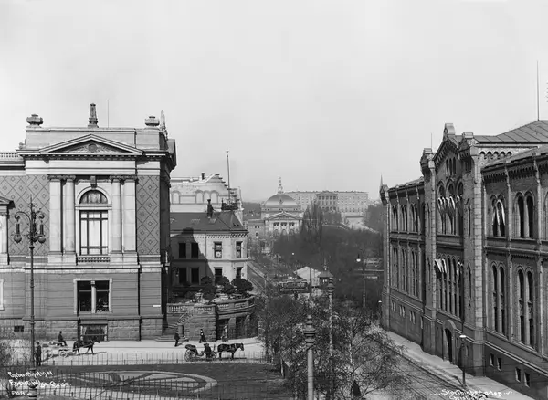 utsikt, Frimurerlogen, park, Stortingsbygningen, forretningsgårder, kiosk, hestekjøretøyer, Nationaltheatret, Slottet