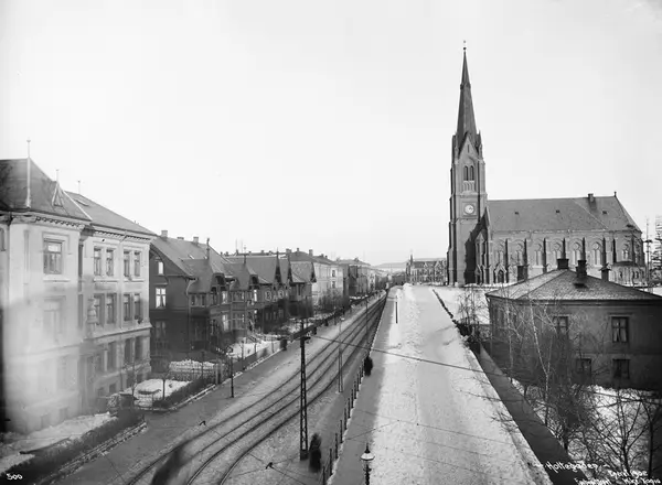 gateløp, Uranienborg kirke, villabebyggelse, hager, trikkeskinner, skolegård