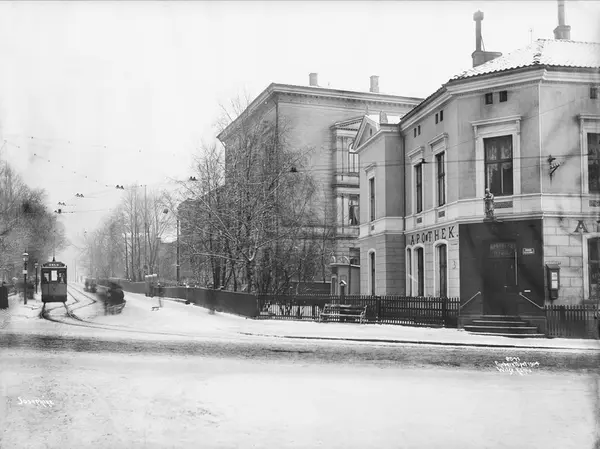 gateløp, bygård, Hygiea apotek, villaer, hager, stakitt, trikk, hestekjøretøyer