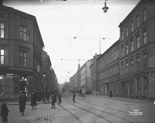 gateløp, bygårder, forretninger, gavlreklame, mennesker, trikk, hestekjøretøy, gateliv