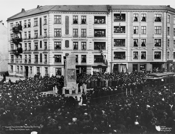 plass, bautastein, avduking, publikum, musikkorps, bygård, forretninger, trikk