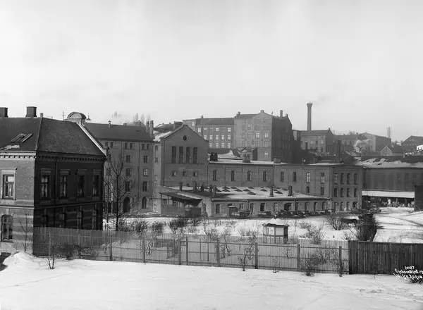 fabrikkbygninger, Foss bryggeri, gjerde, hage, lysthus, Graahs spinneri, "Hønse-Lovisas hus", snø