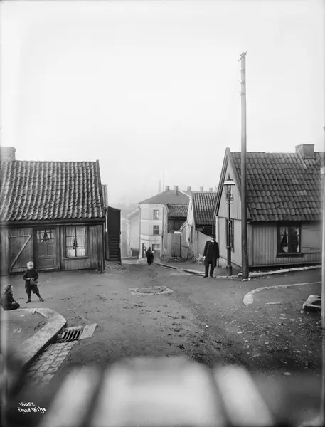 gateløp, trehusbebyggelse, gatebelysning, mennesker, bygård