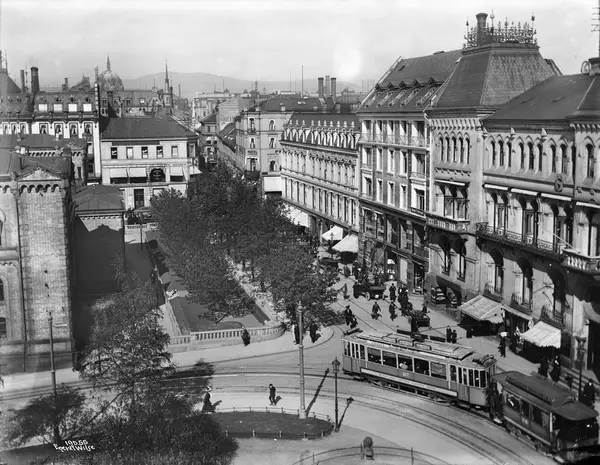 utsikt, Stortingsbygningen, park, forretningsgårder, Atheneum, trikk, bil, hestekjøretøy, mennesker, gateliv