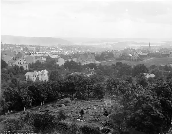 utsikt mot syd-øst, kirkegård, bebyggelse