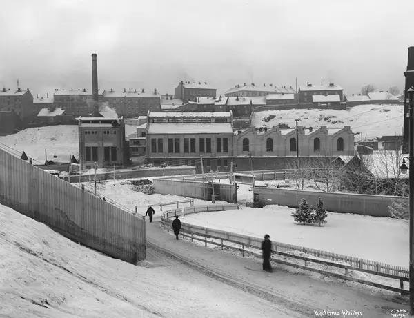Graahs spinneri, fabrikkbygninger, plankegjerder, trehusbebyggelse, bygårder, mennesker, snø