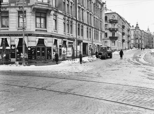 gateløp, bygårder, Johan Ludvig Larsen kolonialforretning, Candy frukt- og tobakksforretning, lastebil, snø, brøytekanyter, mennesker