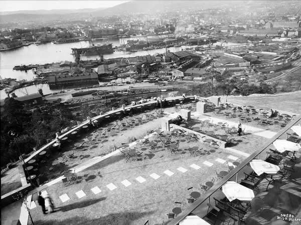 Ekebergrestauranten, terrasse, friluftsrestaurant, gjester, servitør, utsikt, jernbane, havn, skip