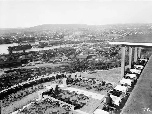 Ekebergrestauranten, terrasse, friluftsrestaurant, gjester, utsikt, bordtomter, jernbane, havn, skip, by