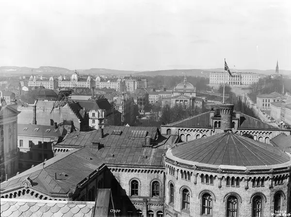 utsikt, Stortingsbygningen, Victoria terrasseNationaltheatret, Slottet, forretningsgårder, Uranienborg kirkes tårn