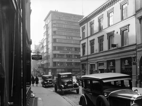 Nærmeste bil er en Buick 1930-31. Videre en Ford AA 1928-29 lastebil med registreringsnummer A-12999 som i Norges Bilbok 1935 var registrert på Brødrene Hallén, Holsts gate 24 e. Deretter A-4230 Chevrolet 1929-30 personbil, som var registrert på Foss Litografiske Trykkeri, Thorvald Meyers gate 9.
