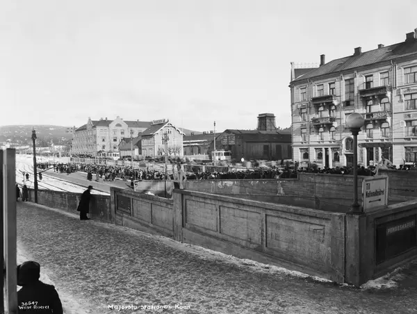 Majorstuen stasjon, mennesker, kø, bygård, trikkestaller, gardeleir