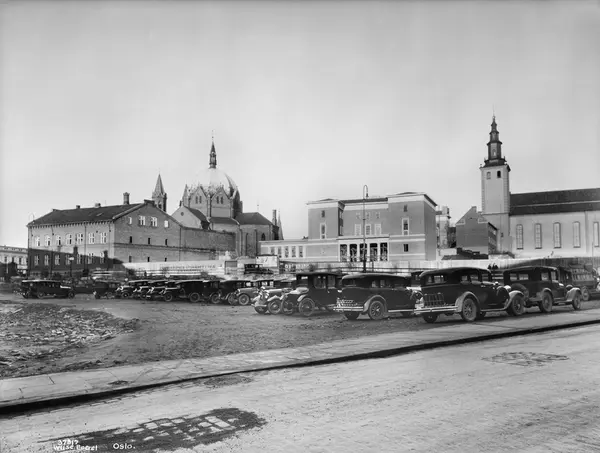 Trefoldighetskirken, Deichmanske bibliotek, Margaretakyrkan, plankegjerde, parkeringsplass, biler