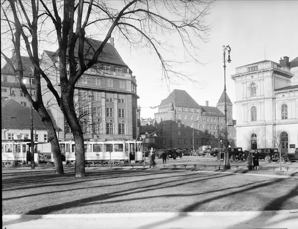forretningsgårder, Den norske Amerikalinje, Østbanestasjonen, mennesker, trikker, biler, park, gatebelysning