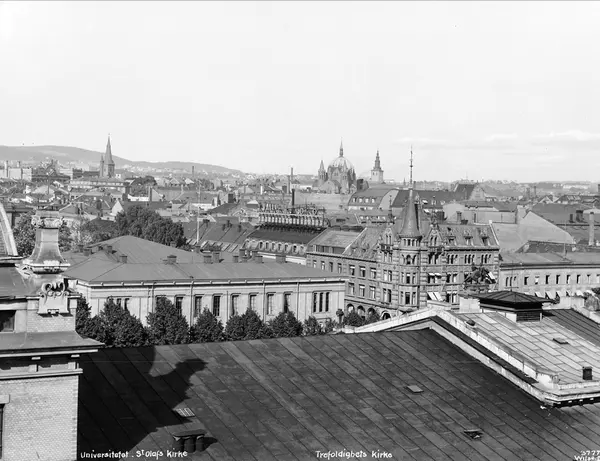 utsikt, Nationaltheatret, tak, forretningsgårder, Universitetet, Trefoldighetskirken, St. Olav kirke
