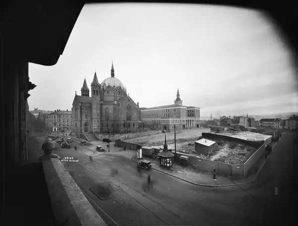 Trefoldighetskirken, Deichmanske bibliotek, anleggsplass, gravearbeid, bygårder, kiosk, biler