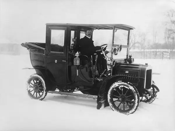 Den ene av byens to første automobildrosjer, en tosylindret Clement 1908 med registreringsnummer Kra. 112, eiet av Otto Olstad i Parkveien 31. Ved rattet sitter Gudbrand Lier som egentlig var drosjesjåfør for Julius Olstad, Niels Juels gate 47.