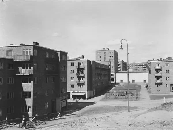 boligblokker, kolonialforretning, tobakksforretning, tørkestativ, gatebelysning, mennesker