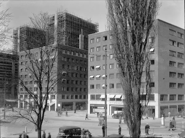 trær, kontorbygninger, Vinmonopolet, Rådhuset, byggevirksomhet, biler, mennesker, gateliv