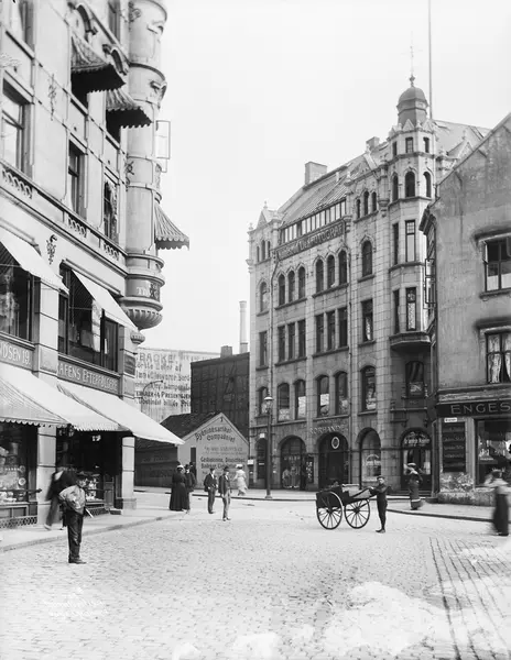 forretningsgårder, Heidenreich rørhandel, fotoatelier, gavlreklame, mennesker, håndkjerre, gateliv
