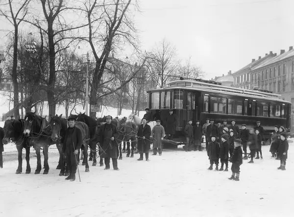 hester, transport av Holmenkollbanens nye vogner, menn, gutter, tilskuere, bygårder