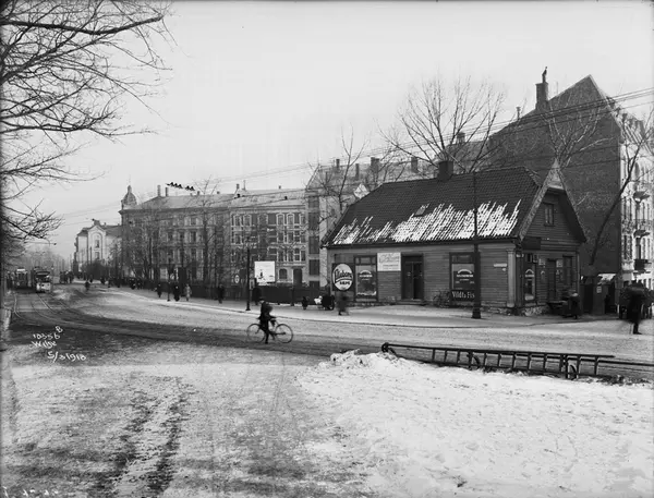 trehus, bygårder, byggetomt, kolonialforretning, trikker, mennesker, gateliv