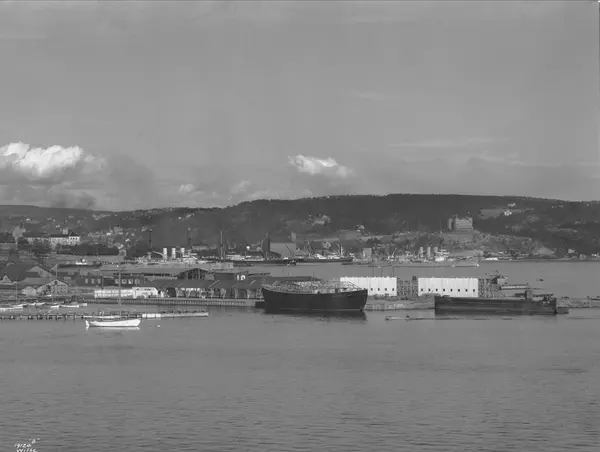 utsikt, havn, båter, polarskip Fram, tyske krigsskip, bebyggelse
