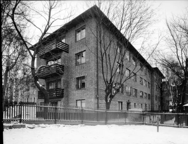 Bildet viser søndre kortside av President Harbitz gate 15 (tidligere 5). Holtegata 1, nå Lallakroken 8, kan såvidet skimtes i bakgrunnen. Bildet er tatt fra skolegården til Frogner kommunale handelsskole (nå del av Hartvig Nissens skole). President Harbitz gate ligger til venstre utenfor bildet.