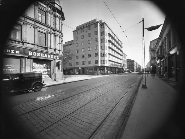 gateløp, bygårder, forretningsgårder, bokhandel, biler, trikkeskinner