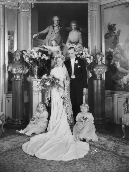 brudepar, brudepiker, blomster, peis, byster, malerier