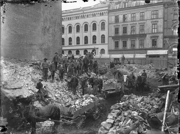 rivningsarbeid, arbeidere, hester, vogner, forretningsgårder