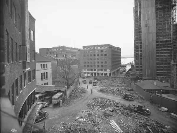Rådhuset, byggevirksomhet, kontorbygninger, lastebiler, arbeidere