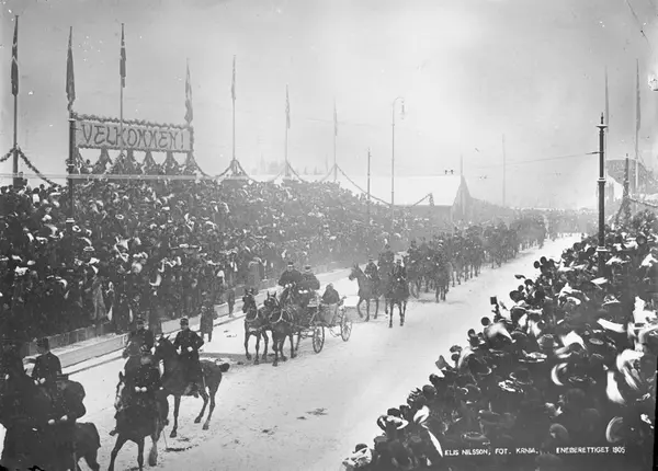 kongeinntoget, hestekjøretøyer, flagg, publikum, tribuner, velkomsthilsen
