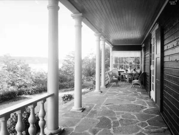 villa, loggia, søyler, terrasse, hagemøbler, kvinne, hund, hage, utsikt