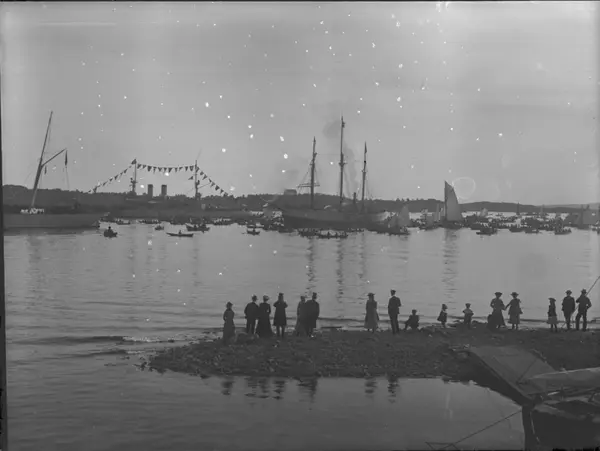utsikt, fjord, polarskip Fram, skip, flaggpryd, småbåtarmada, publikum