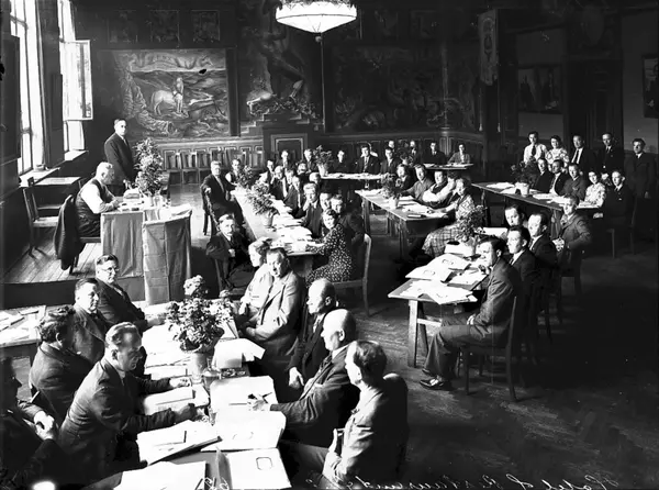 Folkets Hus, interiør, møtelokale, talerstol, langbord, kvinner, menn, veggmalerier, Norsk Hotell- og Restaurantarbeiderforbund, landsmøte