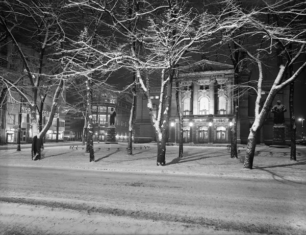 plass, trær, portrettstatuer, Nationaltheatret, Hotel Continental, kontorbygninger, snø, nattemørke