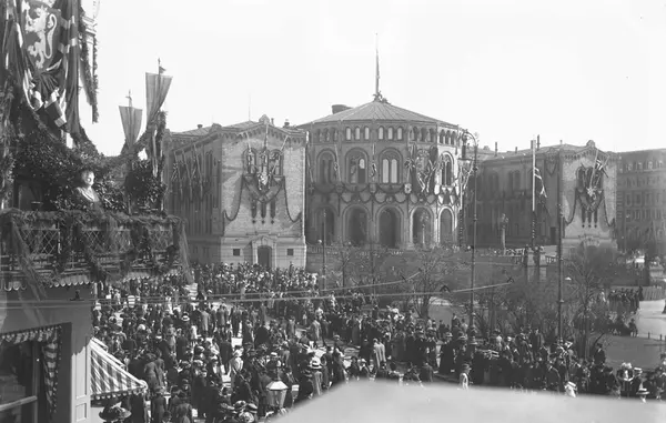 Bjørnstjerne Bjørnsons gravferd, prosesjon, publikum, Stortingsbygningen, Grand Hotels balkong, byste, girlander