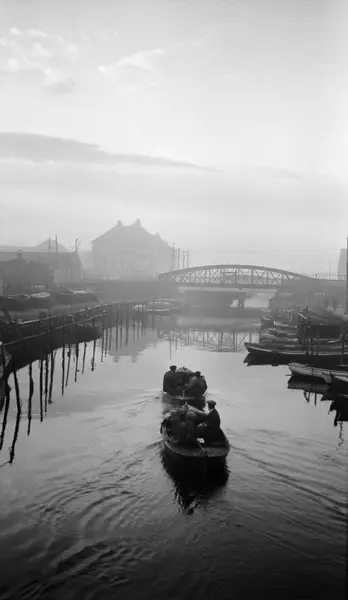 elv, småbåthavn, robåter, menn, bro, NSBs godsekspedisjon